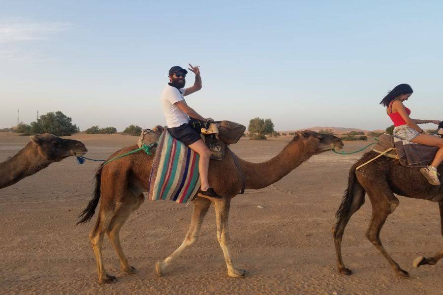 Deixando Errachidia e passando por uma paisagem fascinante, estaremos passando por uma vasta terra e uma estrada esplêndida com muitas palmeiras Oasis. Passando por Aoufouss, em seguida, Erfoud para ver os diferentes tipos de montanhas que parecem muito diferentes das montanhas que você já viu em Marrocos. Chegaremos a Errissani, uma cidade bonita e acolhedora, onde visitaremos Moulay Ali Cherif, que é um mausoléu com um jardim calmo e bonito. Nossa última parada no primeiro dia será Merzouga, andar de camelo para levá-lo às dunas de Erg Chebbi e conhecer os nômades locais com uma grande hospitalidade, aproveitar a noite com uma bela paisagem de instrumentos nômades tradicionais e dança. Depois, tenha uma noite maravilhosa sob o céu azul escuro no vasto deserto marroquino.