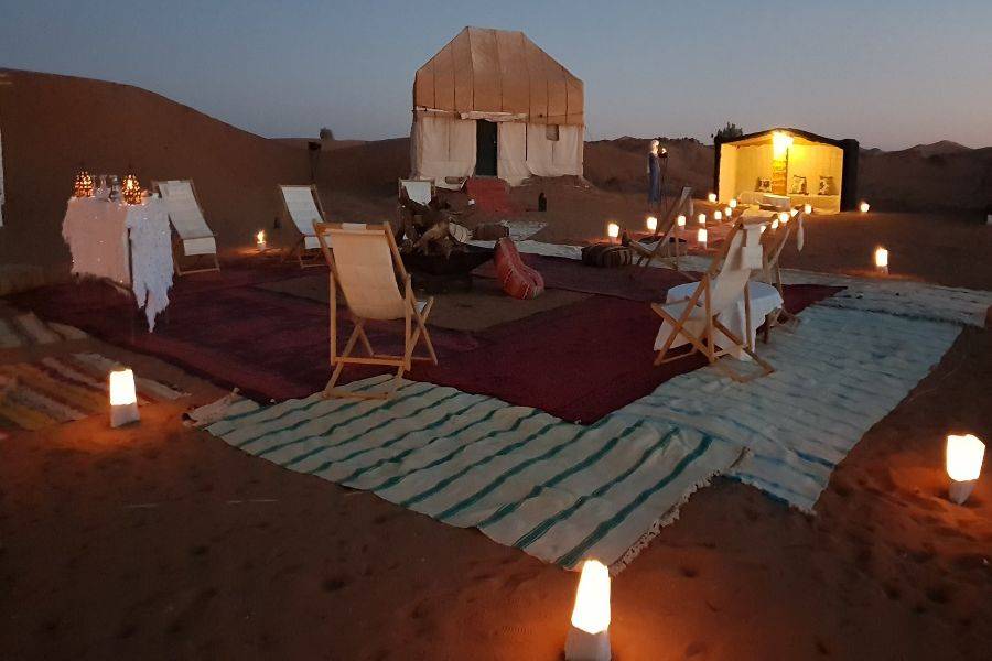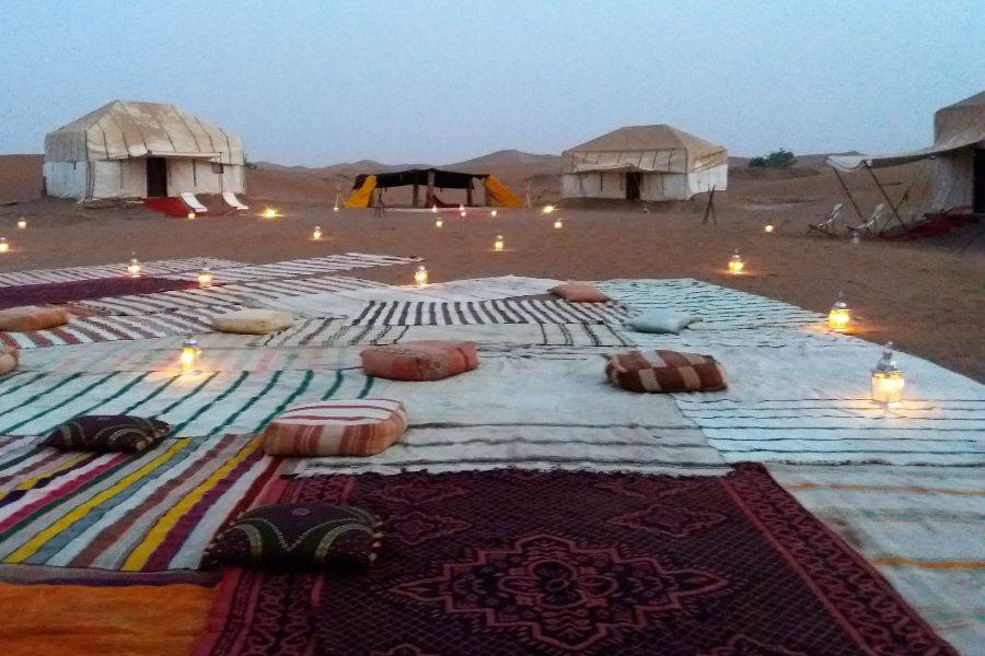 A primeira parada será em Azrou, onde desfrutaremos de um passeio de descoberta para apreciar a floresta e os macacos barbary. Chegaremos a Midelt, uma pequena vila bonita e limpa, famosa pela produção de maçãs. Passaremos pelo vale de Ziz, que tem muitos oásis ao lado da estrada. A segunda parada é em Errachidia, famosa por Kaser Souk, que é um mercado tradicional e é o lugar mais antigo da cidade. Conheça pessoas locais com uma mistura de diferentes culturas entre berbere e árabe. Pararemos para almoçar naquela cidade antes de pegar a estrada. Deixando Errachidia e passando por uma paisagem fascinante, estaremos passando por uma vasta terra e uma estrada esplêndida com muitas palmeiras Oasis. Passando por Aoufouss, em seguida, Erfoud para ver os diferentes tipos de montanhas que parecem muito diferentes das montanhas que você já viu em Marrocos. Chegaremos a Errissani, uma cidade bonita e acolhedora, onde visitaremos Moulay Ali Cherif, que é um mausoléu com um jardim calmo e bonito. Nossa última parada no primeiro dia será Merzouga, andar de camelo para levá-lo às dunas de Erg Chebbi e conhecer os nômades locais com uma grande hospitalidade, aproveitar a noite com uma bela paisagem de instrumentos nômades tradicionais e dança. Depois, tenha uma noite maravilhosa sob o céu azul escuro no vasto deserto marroquino.