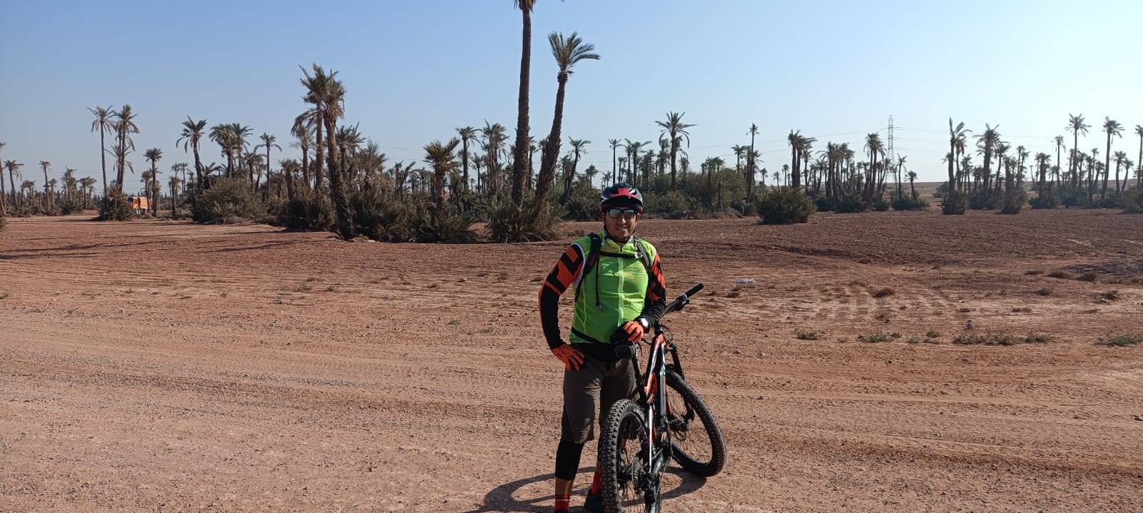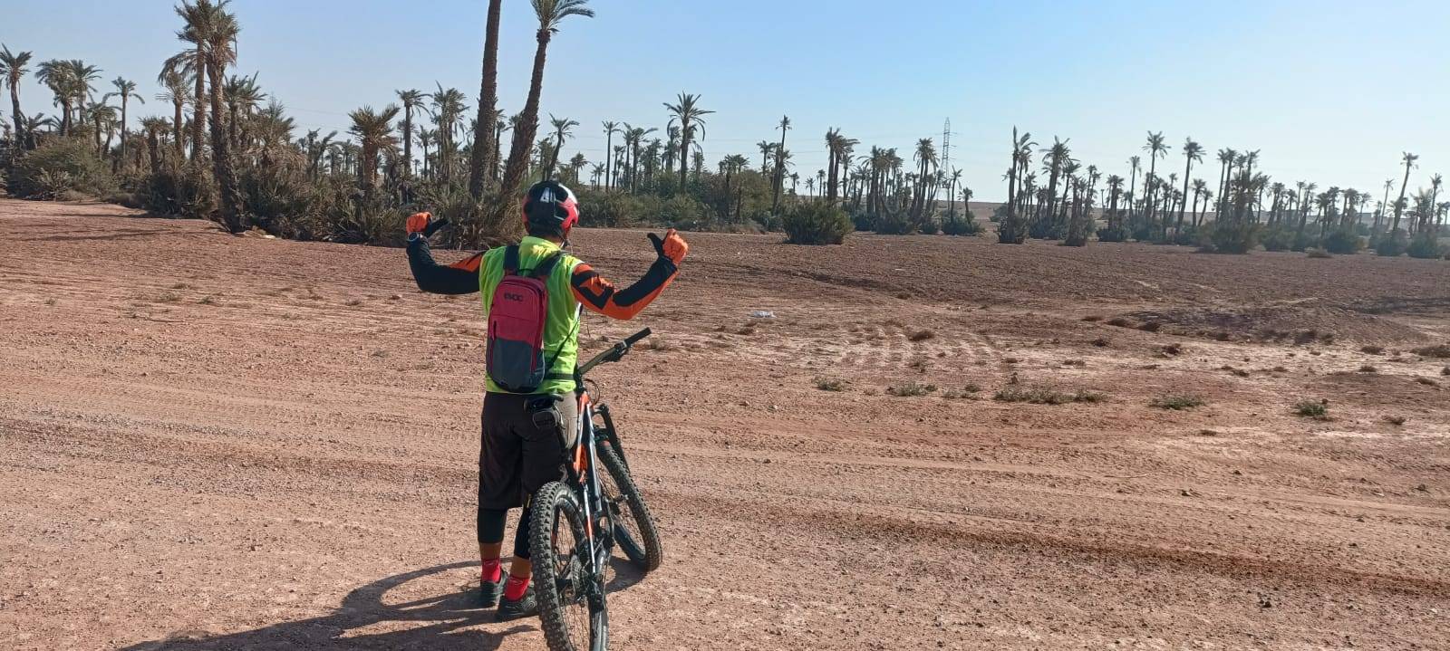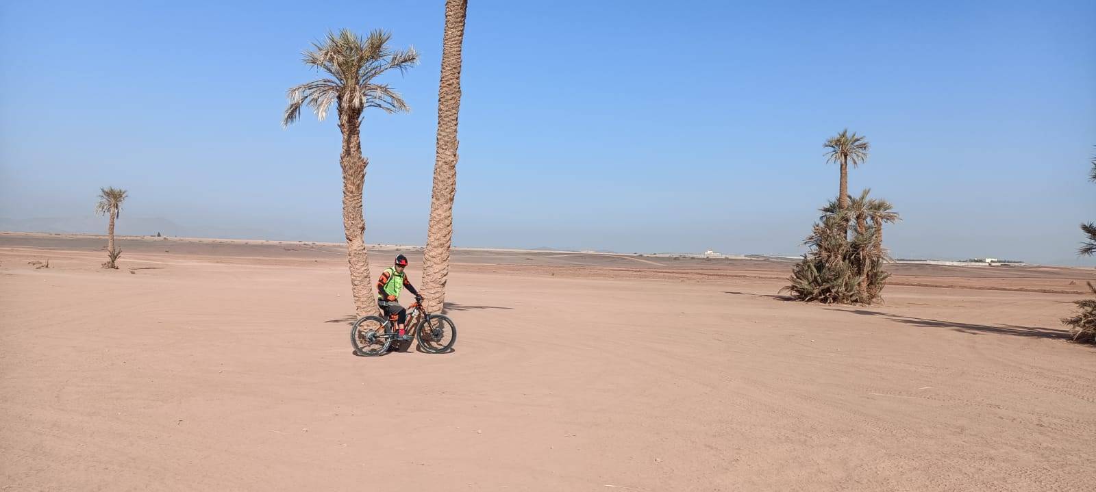 Passeio de bicicleta no Palmeraie (palmeiral) que é um oásis de palmeiras com várias centenas de milhares de palmeiras fora de Marraquexe, situado no limite da secção norte da cidade, a uma altitude de 580m acima do nível do mar, mede 8,0 km de comprimento e cobre uma vasta área de 140 km2, esta parte de Marraquexe é conhecida como um dos destinos favoritos em Marraquexe para os entusiastas dos desportos motorizados como ATVs 4/4 ou para fazer um passeio de camelo ou mesmo de balão.