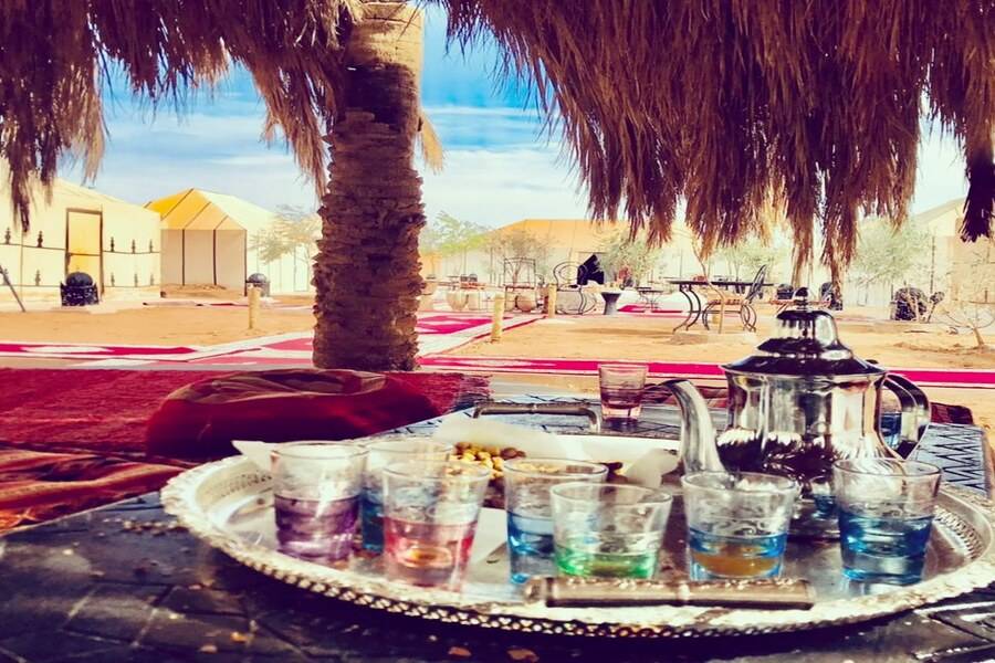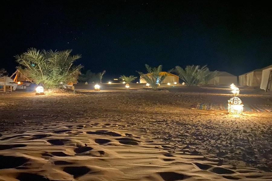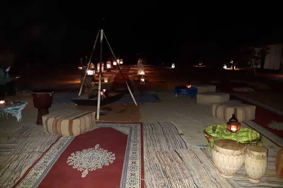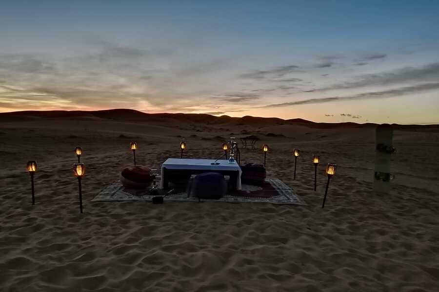 Depois de um tempo para admirar as dunas e as paisagens circundantes, prepare-se para um jantar marroquino servido sob as estrelas ao lado da fogueira. Tarde da noite, seus anfitriões nômades locais irão entretê-lo com sua música e tambores locais.