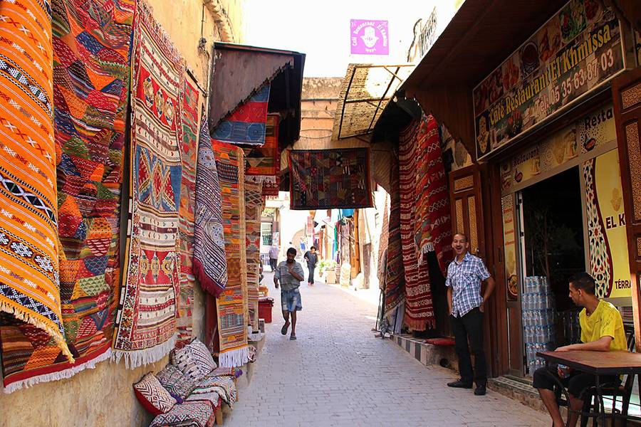 Nosso guia o levará à medina para ver as lojas do mercado ou os souks. Veremos os famosos trabalhos moribundos com o pano colorido pendurado para secar; o Palácio Real, várias mesquitas, escolas teológicas e lojas onde podemos ver artesãos costurando seus trabalhos. A caminhada de hoje é uma visão incrível da vida da cidade marroquina, onde pouco mudou ao longo dos séculos.