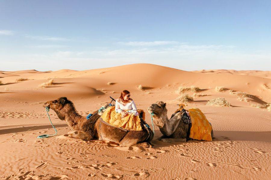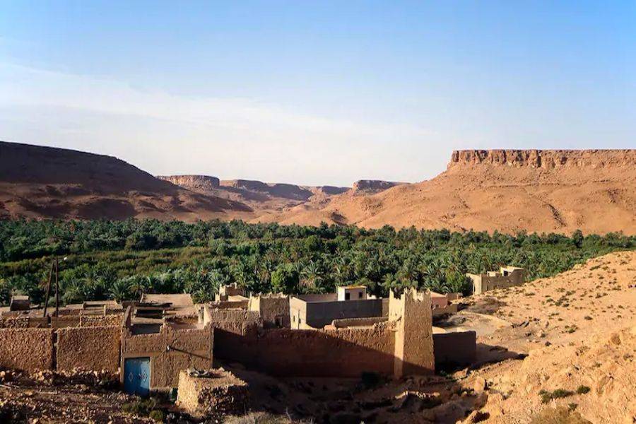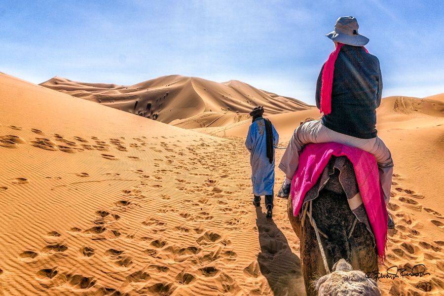 Deixando Errachidia e passando por uma paisagem fascinante, estaremos passando por uma vasta terra e uma estrada esplêndida com muitas palmeiras Oasis. Passando por Aoufouss, em seguida, Erfoud para ver os diferentes tipos de montanhas que parecem muito diferentes das montanhas que você já viu em Marrocos. Chegaremos a Errissani, uma cidade bonita e acolhedora, onde visitaremos Moulay Ali Cherif, que é um mausoléu com um jardim calmo e bonito. Nossa última parada no primeiro dia será Merzouga, andar de camelo para levá-lo às dunas de Erg Chebbi e conhecer os nômades locais com uma grande hospitalidade, aproveitar a noite com uma bela paisagem de instrumentos nômades tradicionais e dança. Depois, tenha uma noite maravilhosa sob o céu azul escuro no vasto deserto marroquino.